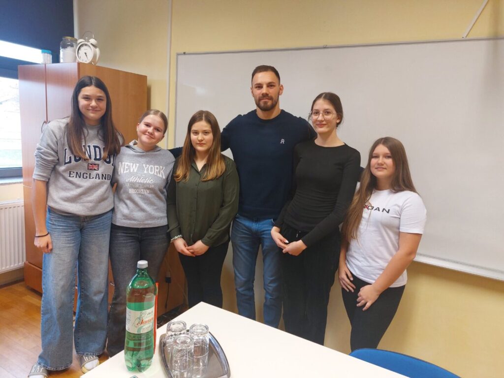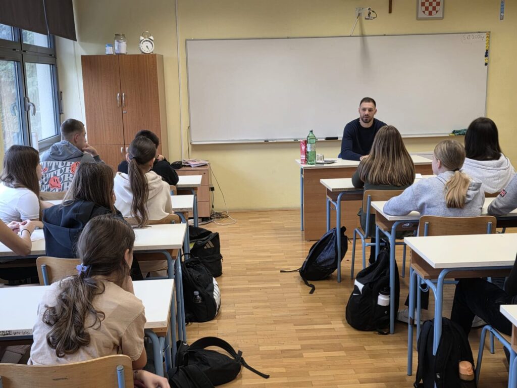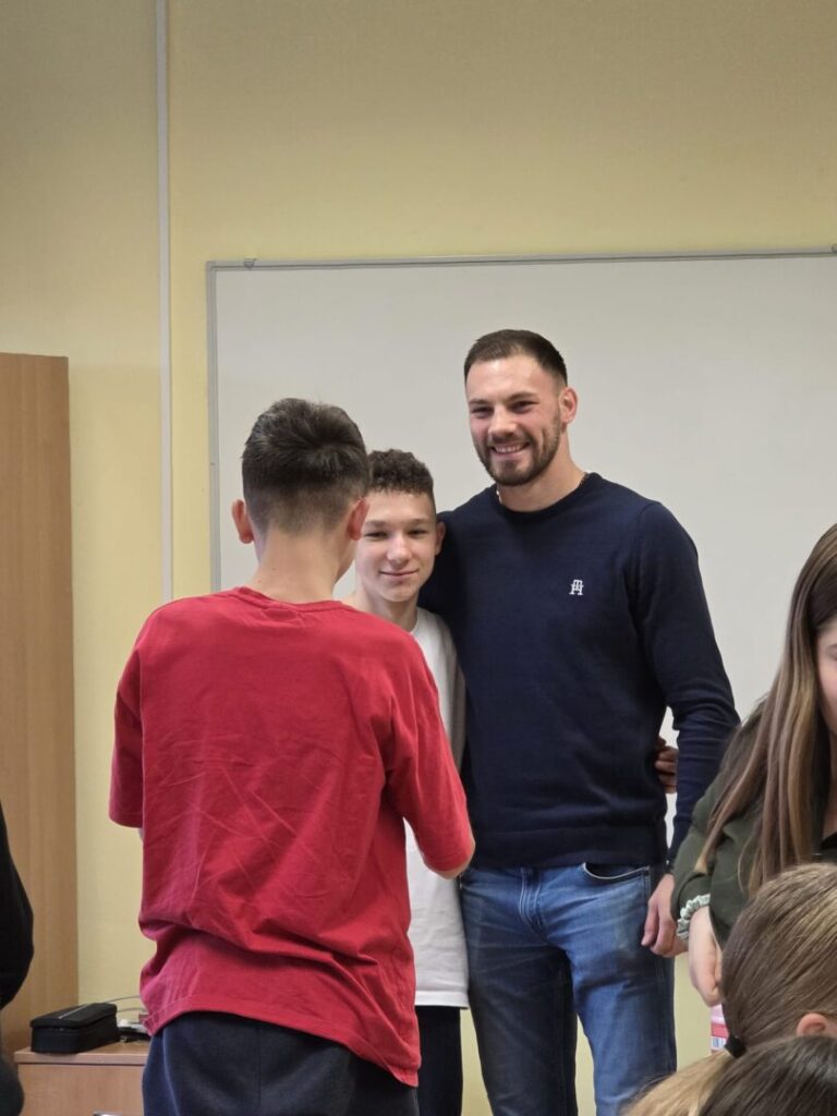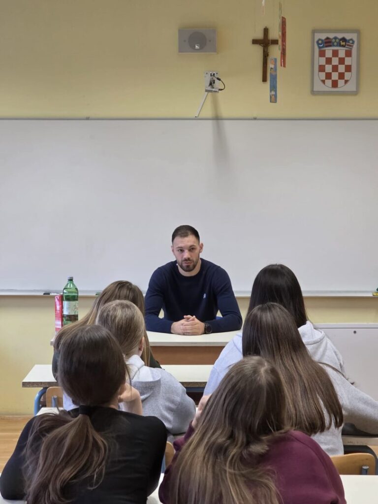 Učenici dodatne nastave povijesti i novinarke naše škole uzbuđeno su iščekivali dolazak poznatog boksača Gabrijela Veočića. Pozvali smo ga i ugostili u našoj školi 5. prosinca 2025. godine u sklopu projekta „Moja životna priča – moja povijest“. Dočekali smo ga velikim pljeskom i riječima dobrodošlice učenice Ive Gabaldo. Nasmijan i jednostavan sve nas je oduševio svojom simpatičnošću. Spremno je odgovarao na naša mnogobrojna pitanja, a priznao nam je i da osjeća malu tremu. Boks je počeo trenirati u osmoj godini gledajući svog oca kako trenira. Naglasio je važnost upornosti, discipline i redovitog treniranja, trenira 2 do 3 puta dnevno. Najveća podrška mu je otac, koji je i njegov trener, ali i obitelj i prijatelji. Učenici su pažljivo i sa zanimanjem slušali dok je iznosio svoja iskustva od prvih dana bavljenja boksom pa sve do osvajanja brojnih medalja. Ima 6 europskih medalja iza sebe, u seniorskoj konkurenciji bio je prvak Europe 2024. godine, to mu je jedan od najdražih uspjeha, a najveći uspjeh mu je bronca na nedavnom Svjetskom prvenstvu 2025. godine i 5. mjesto na Olimpijskim igrama. Pokazao je učenicima i neke osnovne borilačke zahvate. Sve se odvijalo u opuštenoj i prijateljskoj atmosferi, a susret je završio fotografiranjem za uspomenu. Ostavio je snažan dojam na učenike, poručio im je da budu dobri učenici, uporni jer jedino tako mogu uspjeti.