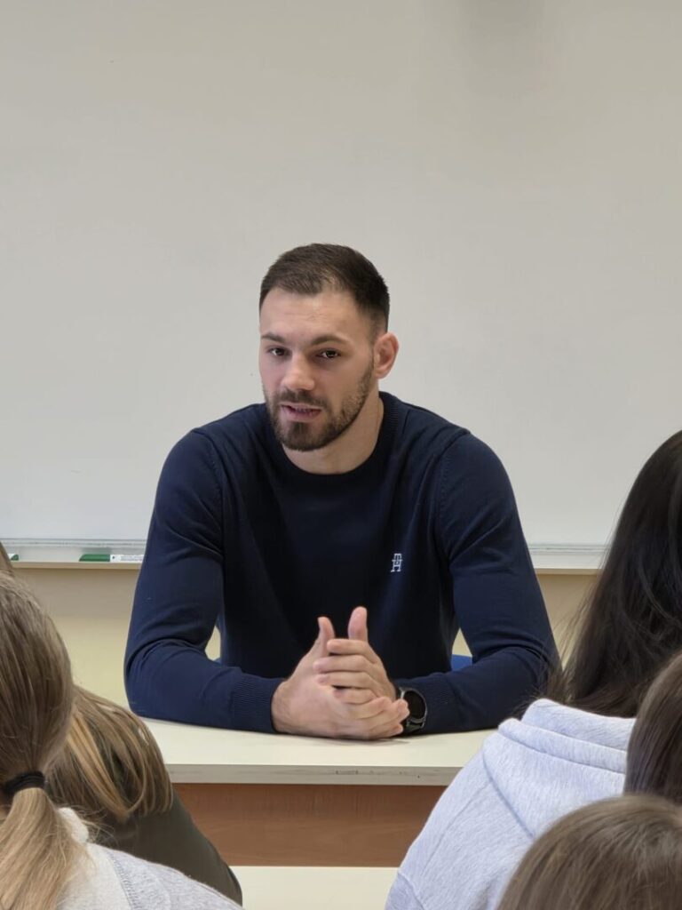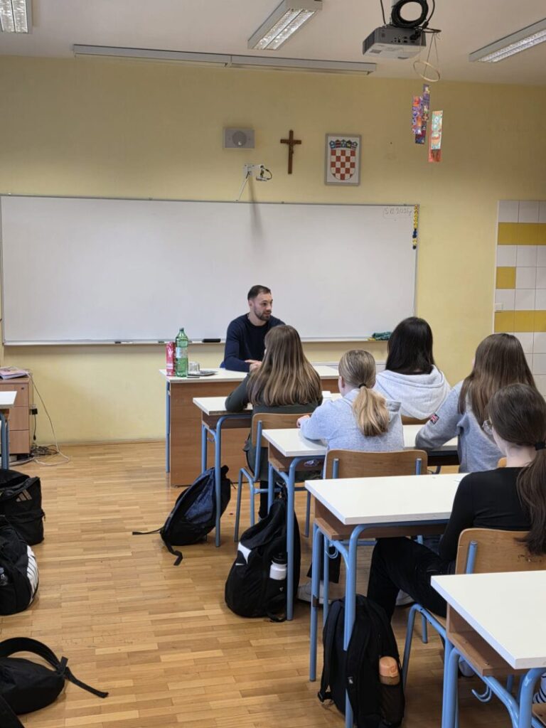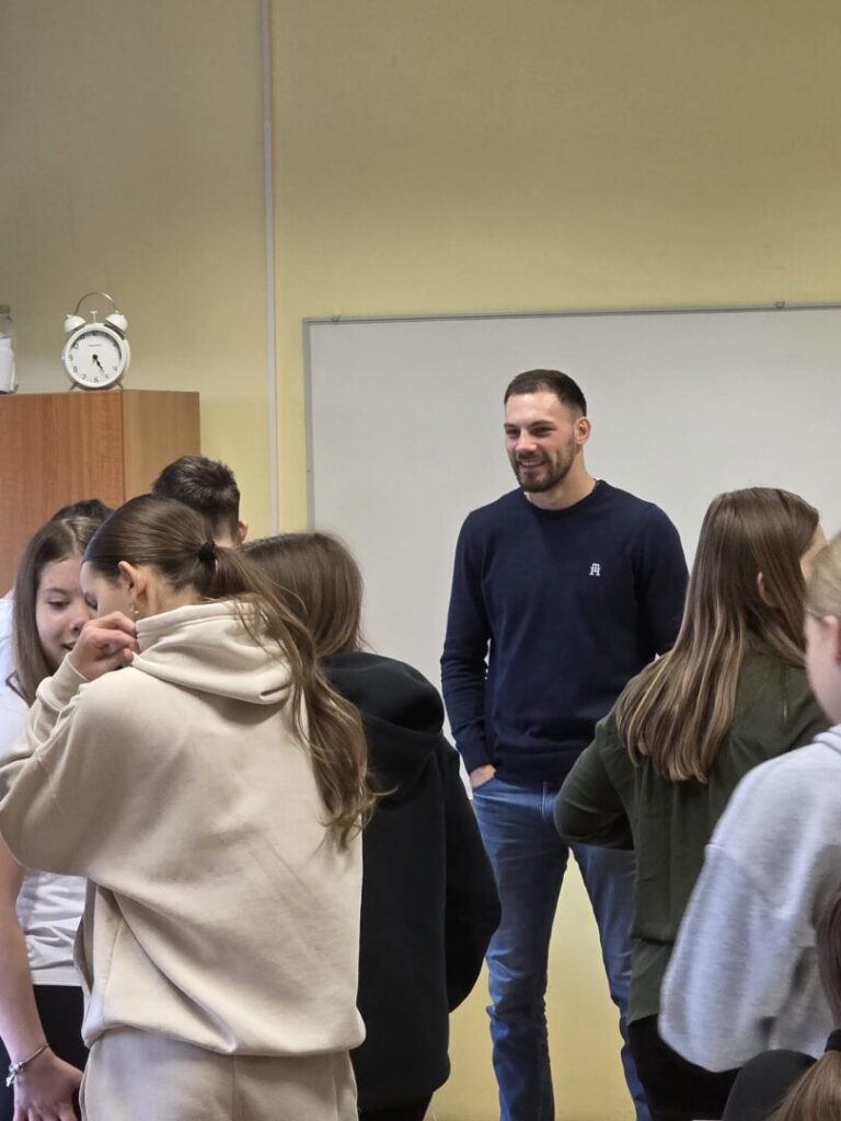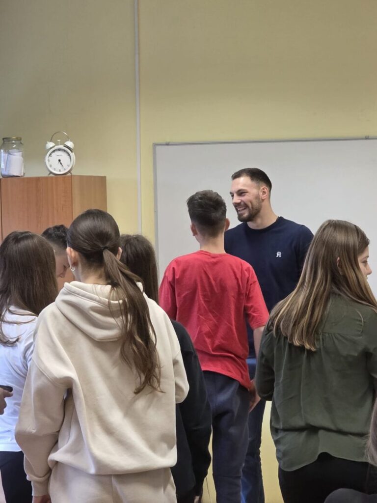 Učenici dodatne nastave povijesti i novinarke naše škole uzbuđeno su iščekivali dolazak poznatog boksača Gabrijela Veočića. Pozvali smo ga i ugostili u našoj školi 5. prosinca 2025. godine u sklopu projekta „Moja životna priča – moja povijest“. Dočekali smo ga velikim pljeskom i riječima dobrodošlice učenice Ive Gabaldo. Nasmijan i jednostavan sve nas je oduševio svojom simpatičnošću. Spremno je odgovarao na naša mnogobrojna pitanja, a priznao nam je i da osjeća malu tremu. Boks je počeo trenirati u osmoj godini gledajući svog oca kako trenira. Naglasio je važnost upornosti, discipline i redovitog treniranja, trenira 2 do 3 puta dnevno. Najveća podrška mu je otac, koji je i njegov trener, ali i obitelj i prijatelji. Učenici su pažljivo i sa zanimanjem slušali dok je iznosio svoja iskustva od prvih dana bavljenja boksom pa sve do osvajanja brojnih medalja. Ima 6 europskih medalja iza sebe, u seniorskoj konkurenciji bio je prvak Europe 2024. godine, to mu je jedan od najdražih uspjeha, a najveći uspjeh mu je bronca na nedavnom Svjetskom prvenstvu 2025. godine i 5. mjesto na Olimpijskim igrama. Pokazao je učenicima i neke osnovne borilačke zahvate. Sve se odvijalo u opuštenoj i prijateljskoj atmosferi, a susret je završio fotografiranjem za uspomenu. Ostavio je snažan dojam na učenike, poručio im je da budu dobri učenici, uporni jer jedino tako mogu uspjeti.